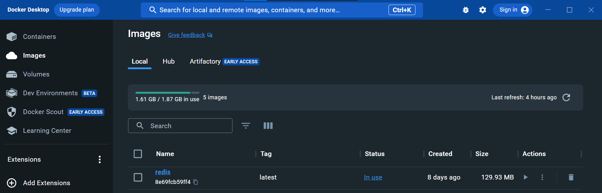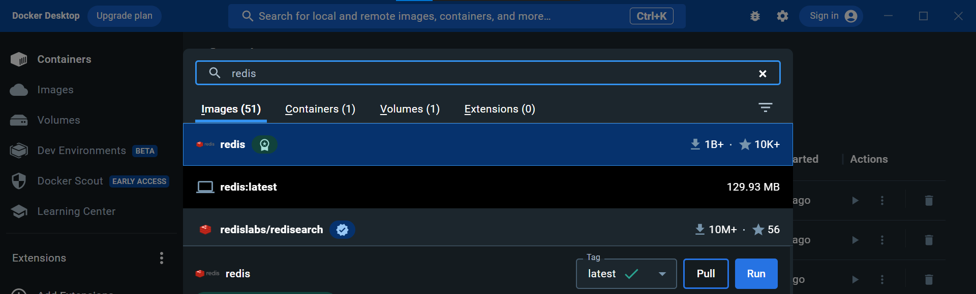 Untuk pengguna docker dekstop dapat install Redis dengan cara search Redis Image di bagian search docker, lalu klik pull. Begitu installasi selesai, image akan langsung muncul di Tab Image.